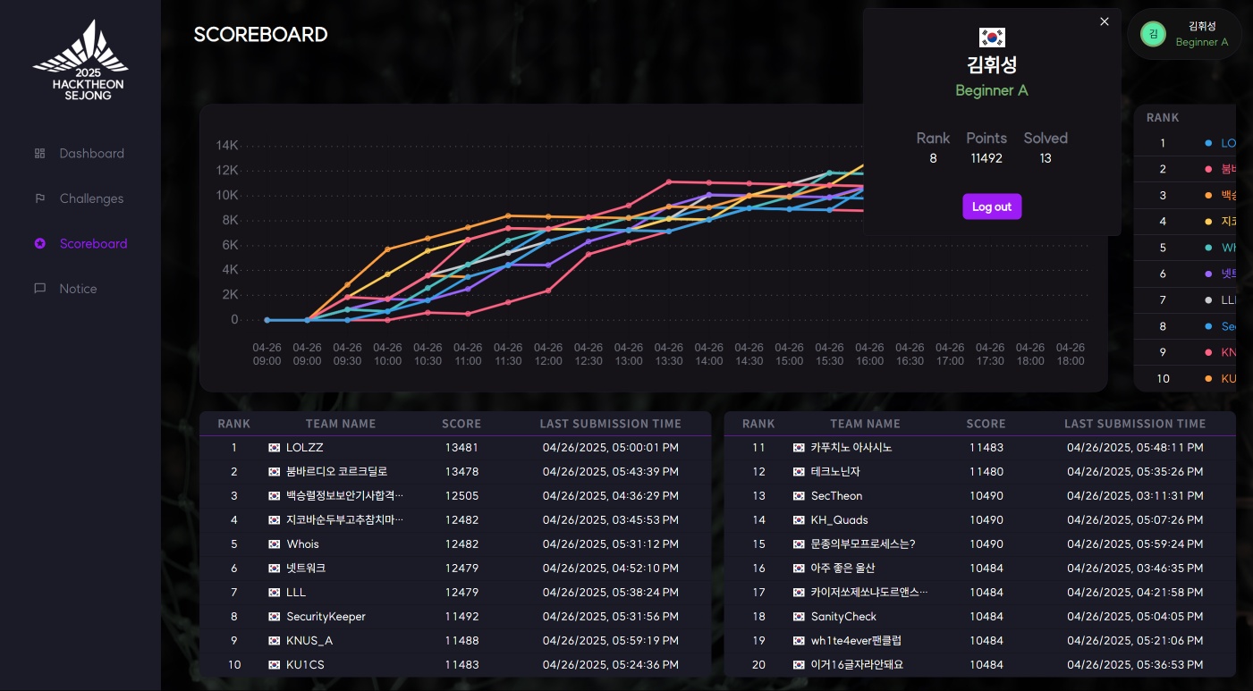 스코어보드는 못 찍었는데 초급 10팀 + 해외 초급 10팀 해서 총 20팀 중 꼴등이었다. ㅠㅠ
