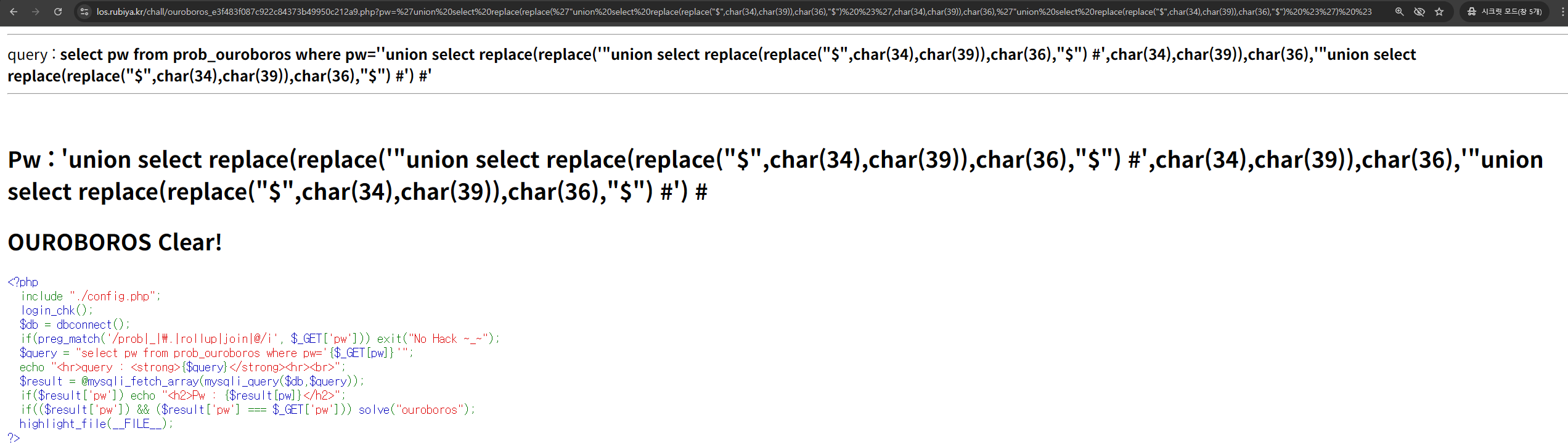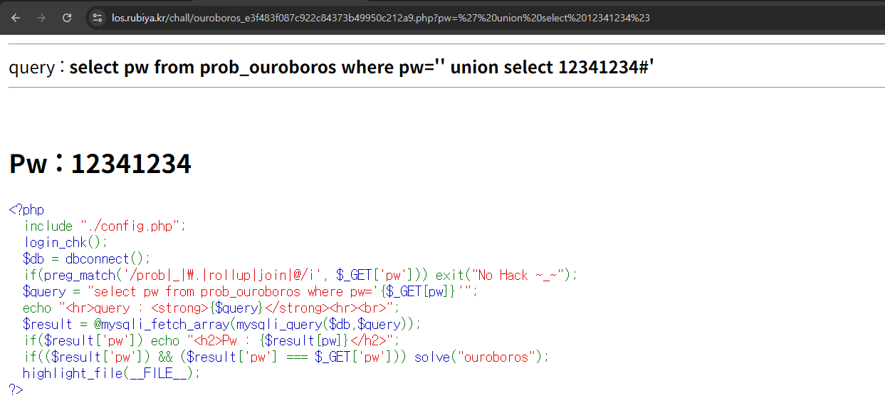 if(($result['pw']) && ($result['pw'] === $_GET['pw'])) solve("ouroboros");